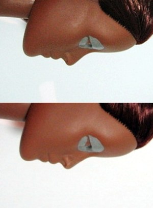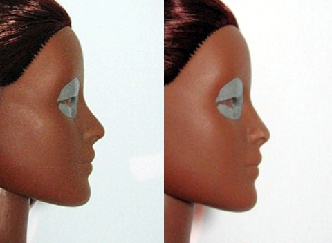 Spice/Devon had her nose shaved down today. No anesthetic. Tool of choice: X-acto Knife. In order to give Spice a more typically Asian nose shape, it was necessary to widen it. I might be able to get away with not adding to the sides now that I’ve flattened the bridge. Time will tell. The difference isn’t astounding, but it’s definitely noticeable. I also sanded smooth the areas around the eyes that I filled with sculpting epoxy. She still looks like a faceless, masked super heroine. I think she’s looking forward to more progress.