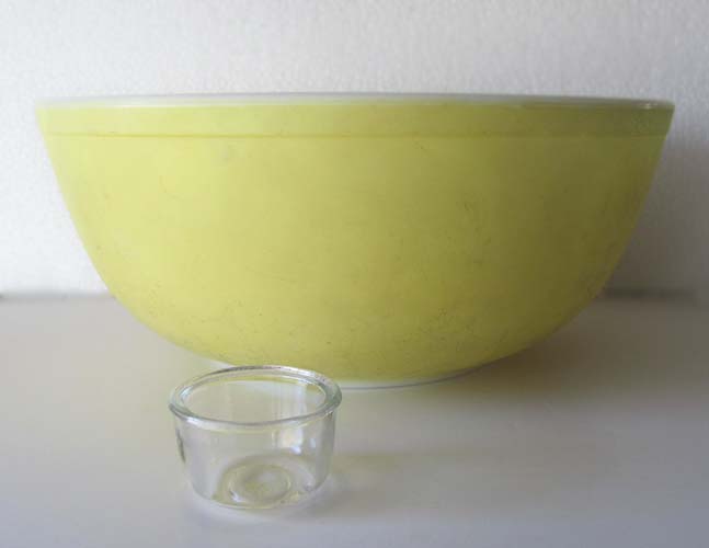 The yellow bowl is approximately 10 and 1/2 inches across at the widest point and a little more than 4 and 1/2 inches tall. The glass sediment bowl (from this moment on now known as the clear glass, 1:6 scale, mixing bowl) is 1 and 7/8 inches across at the top and approximately 1 and 1/4 inches tall. So…in TRW, the clear glass bowl would translate into a slightly larger bowl than the yellow bowl, but not so much that it looks out of scale in our 1:6 scale kitchens. Hooray!